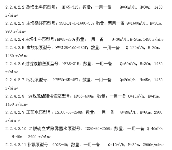 请提供现有脱硫主塔及副塔吸收段浆液泵、工艺水泵的规格、型号、材质、数量,及现有设备的清册。